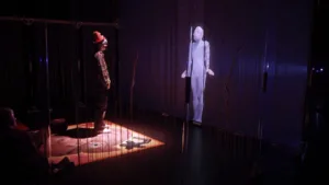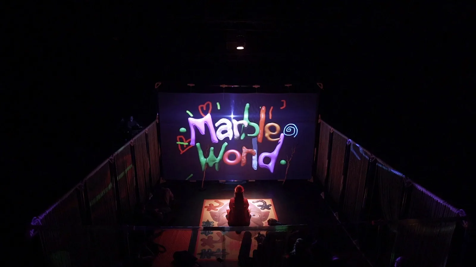 Marble Looks Back is an interactive XR installation wherein a participant visits Marble, a projected hologram of a game character.Marble, who is puppeteered by an actor in VR, engages with the participant in an existential conversation about the awkwardness ofinteracting through a projection screen.