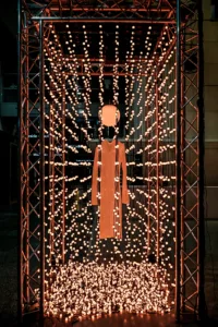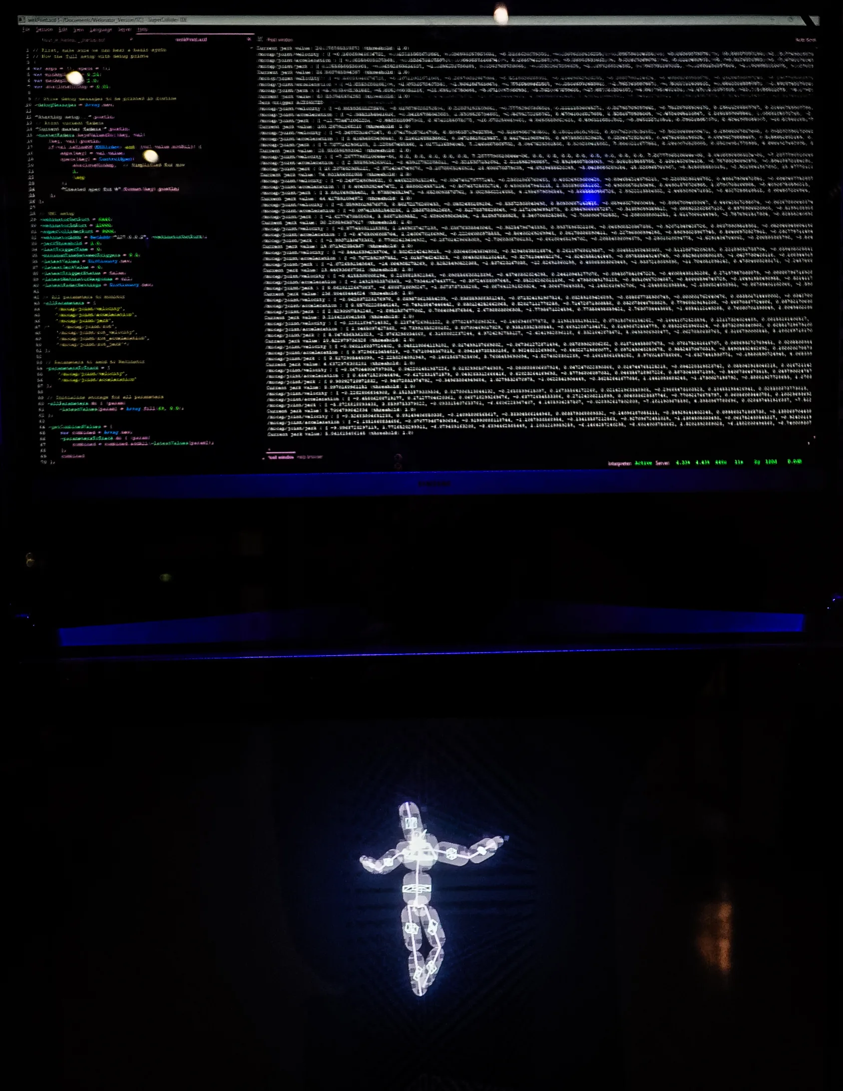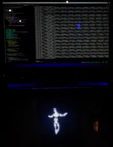 For ICK Amsterdam’s production NOUS LE RADEAU I developed a 3D light hologram sculpture that continues the movements of the dancers using motion captured data to resynthesize their bodies as light. Motion capture technology is used during the piece to synthesize sounds using algorithms and AI developed by Jorrit Tamminga, Farzaneh Nouri and Salvador Breed . These same algorithms are also running live in a simulated environment for the installation where fragments of the piece are continually reiterated upon.It was an honour to create this installation piece in such close collaboration with the amazingly talented team listed below.