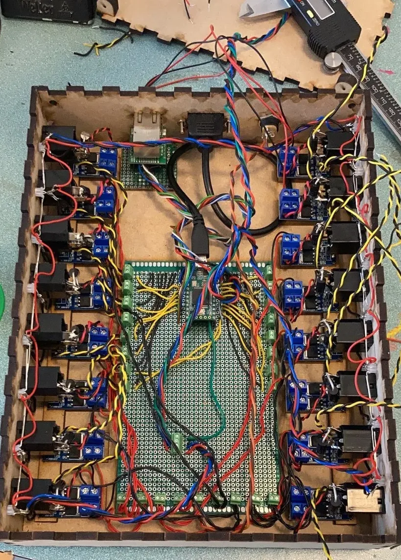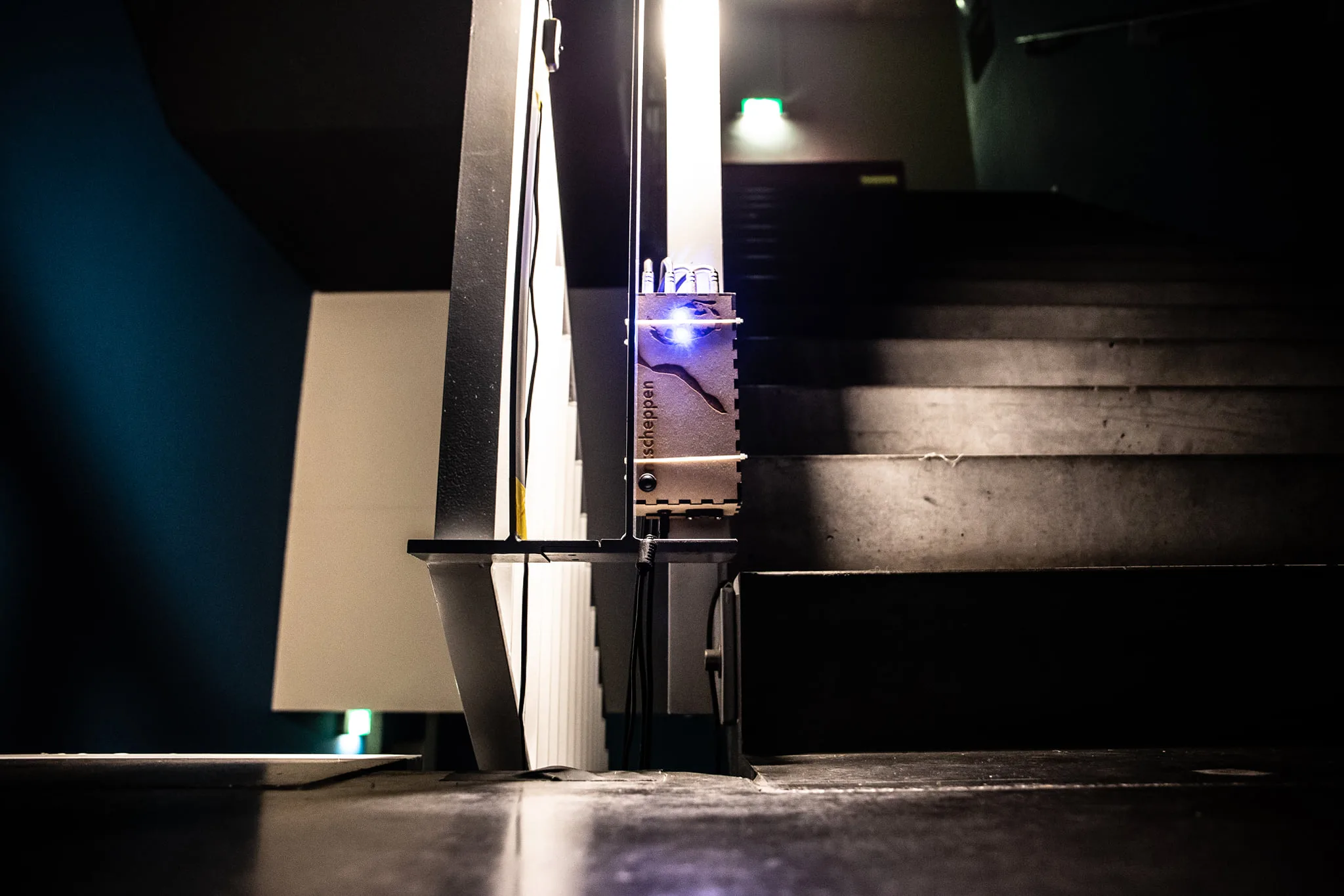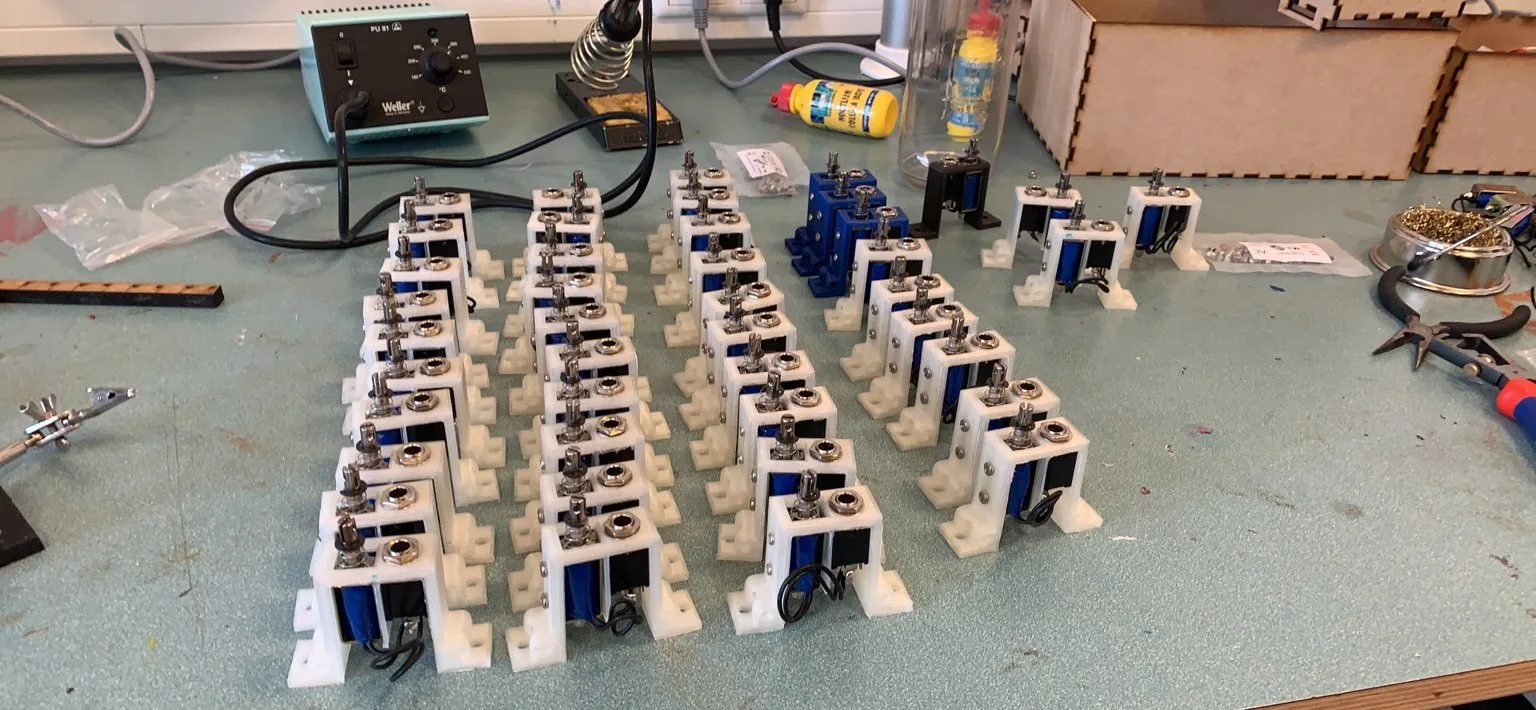 For the Minimal Music Festival 2021 in the I worked on a mechanical sound installation for the “Ontscheppen” performance by Janne Piksen. I was in charge of developing a system / instrument that could remotely control ~60 solenoids that were spread throughout the Muziekgebouw Amsterdam building. These solenoids were attached to the different surfaces and materials in the building; concrete, wood, glass, iron and metal. By triggering the solenoids they excited the natural sounds of the building’s materials creating a soundscape made up of the true sound of the Muziekgebouw. Effectively turning the Muziekgebouw into a giant instrument.